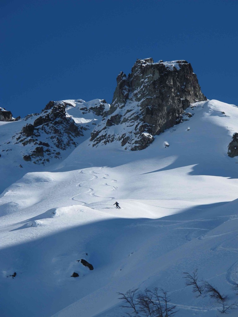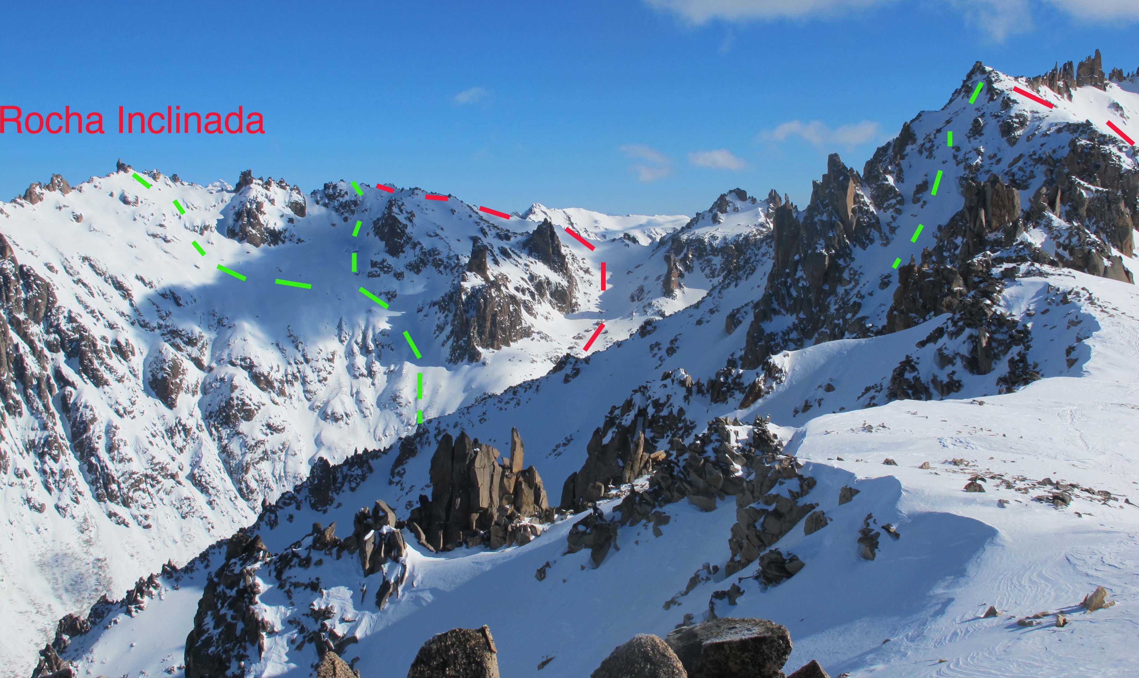 A great day out in the mountains. Some people need coffee to wake up I prefer to solo ski steep lines. Up and up till I could get into the line on lookers right, fun steep and fast down to the valley. Up past the Frey Refugio and to the south side of Rocha Inclinada, leaning rock summit. I hoped to get on top but it looked a little beyond my safety co-efficient.